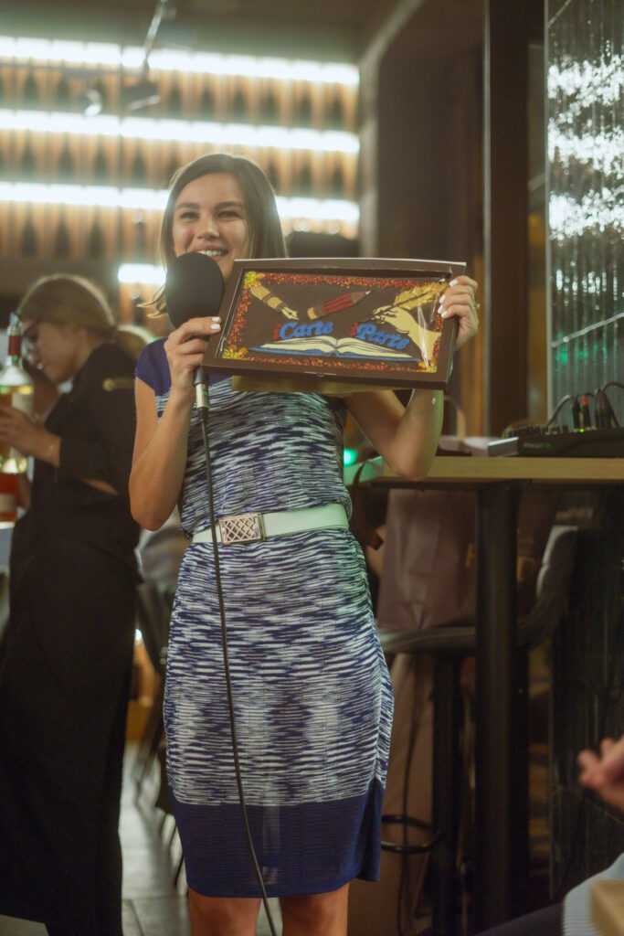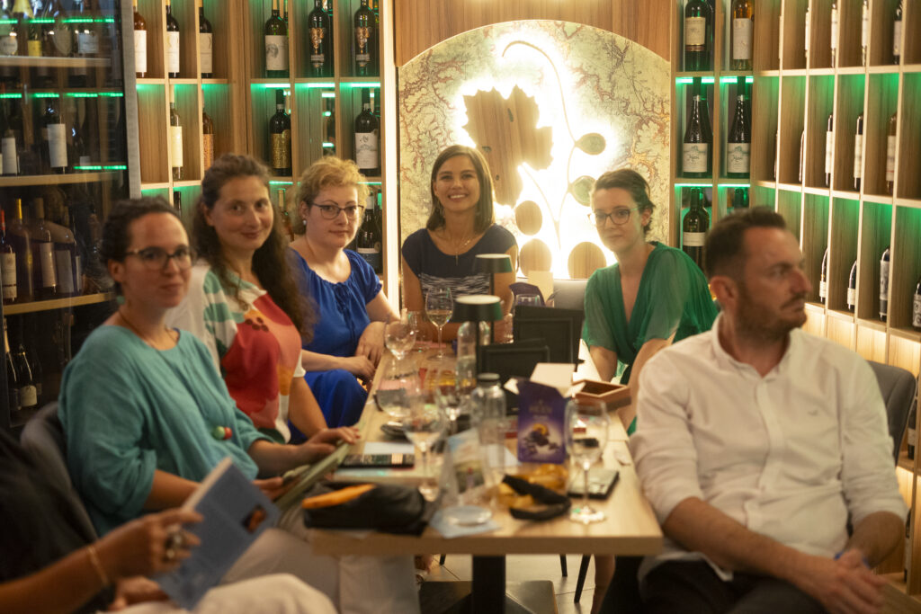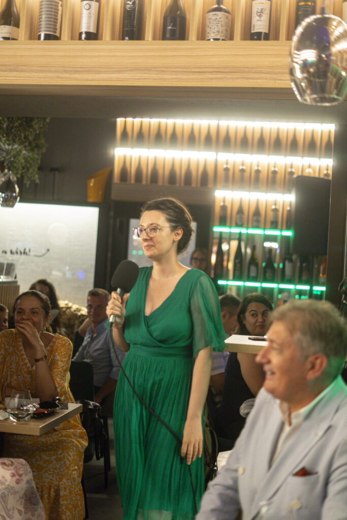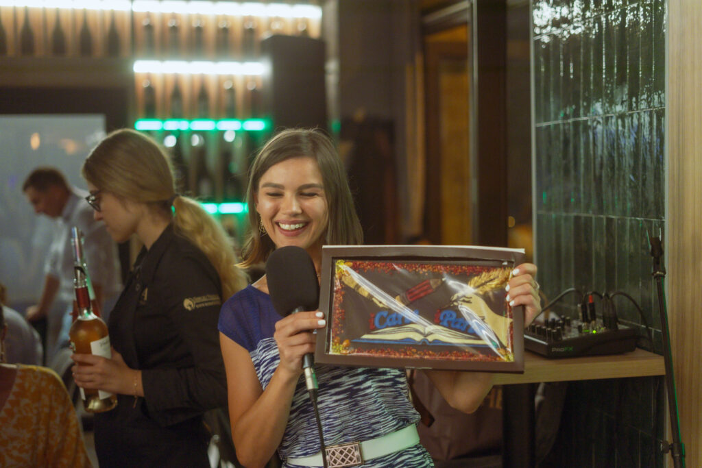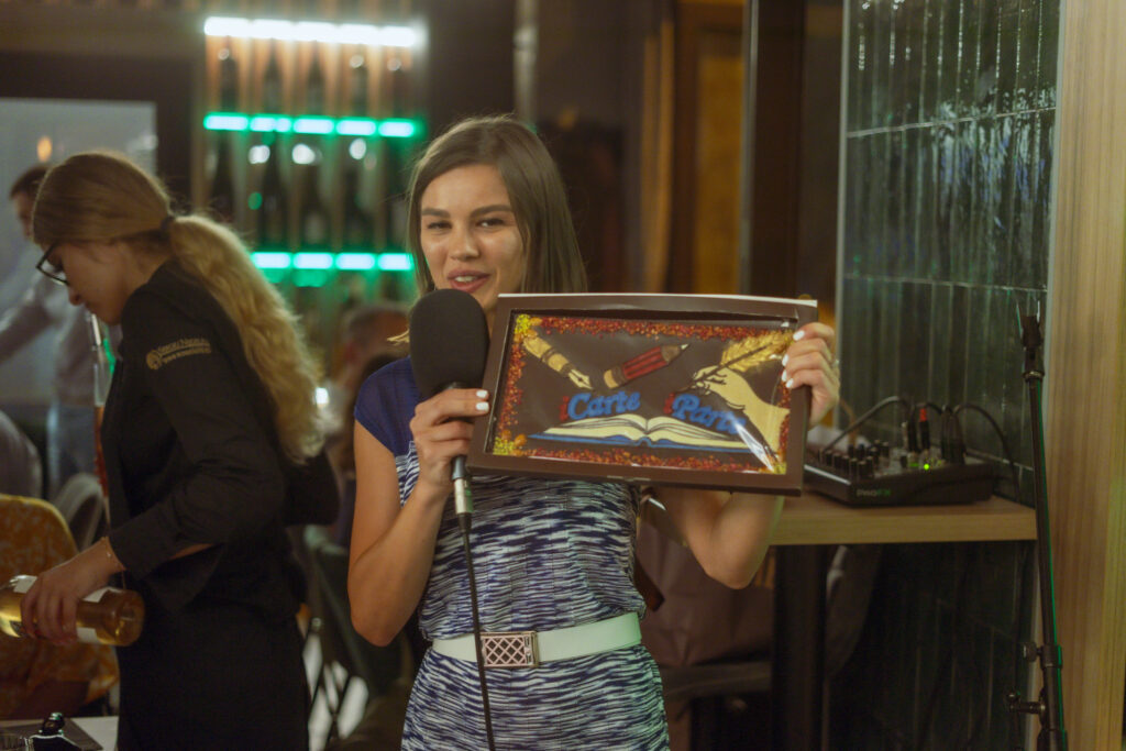Prima ediție Books and Wine a avut loc pe 11 iulie, unde invitat a fost scriitorul Radu Paraschivescu, a cărui prezență ne place ORICÂND și sperăm să-l revedem și în cadrul altor evenimente, iar Maria Roxana Șerban ne-a încântat cu vocea sa. 30 de cititori ne-am adunat la Uva Wine, un loc ce pune la dispoziție peste 450 de sortimente de vin și platouri cu brânzeturi alese, iar jocul “Ghicește personajul!”, care a început în taberele de lectură pentru adulți, a fost foarte distractiv și ne-a destins pe parcursul serii.