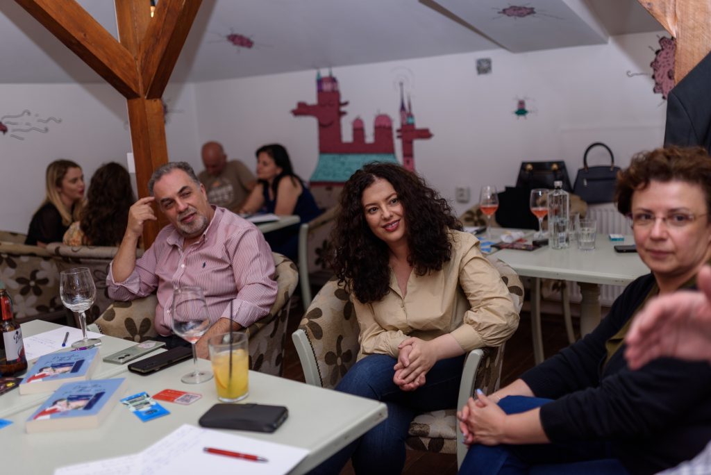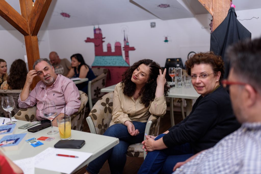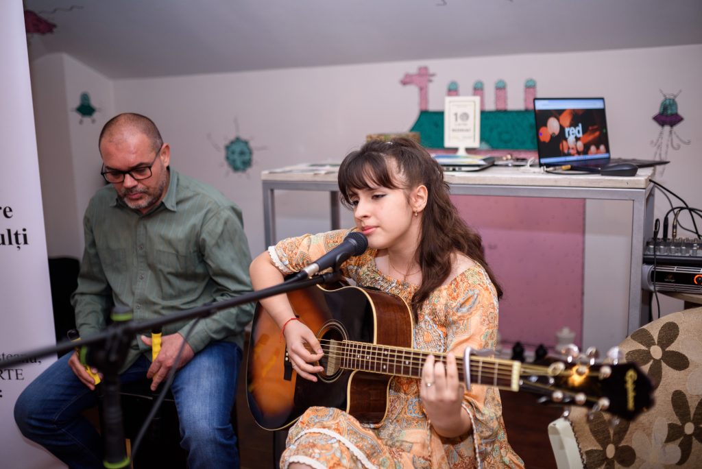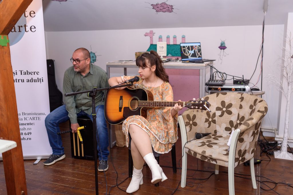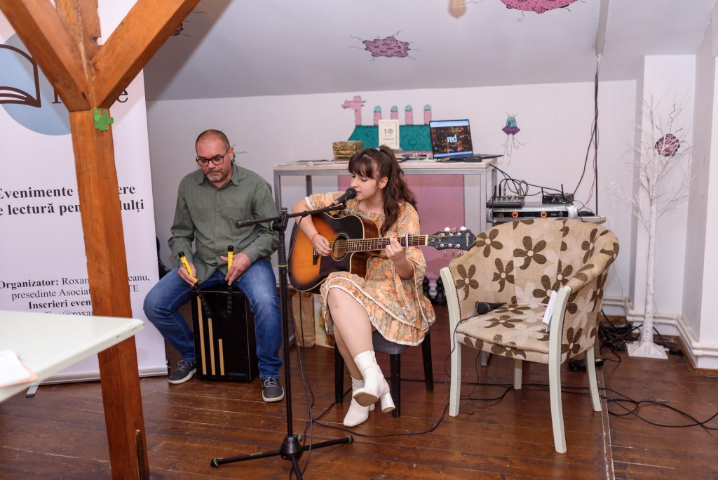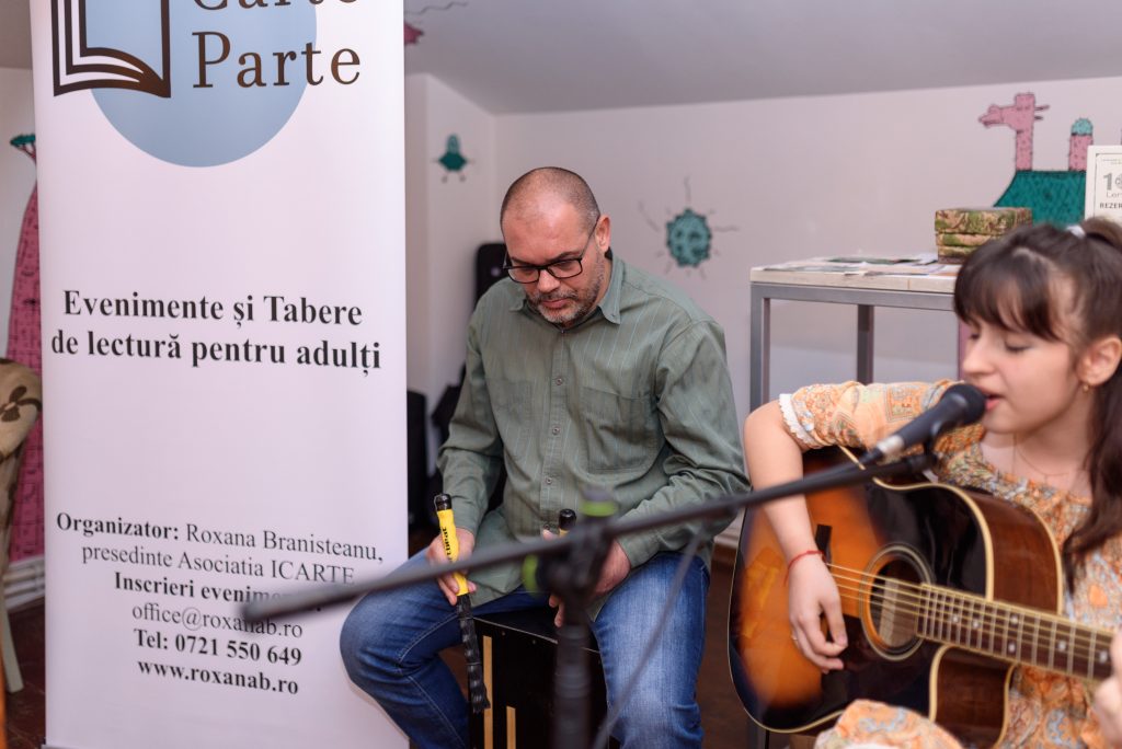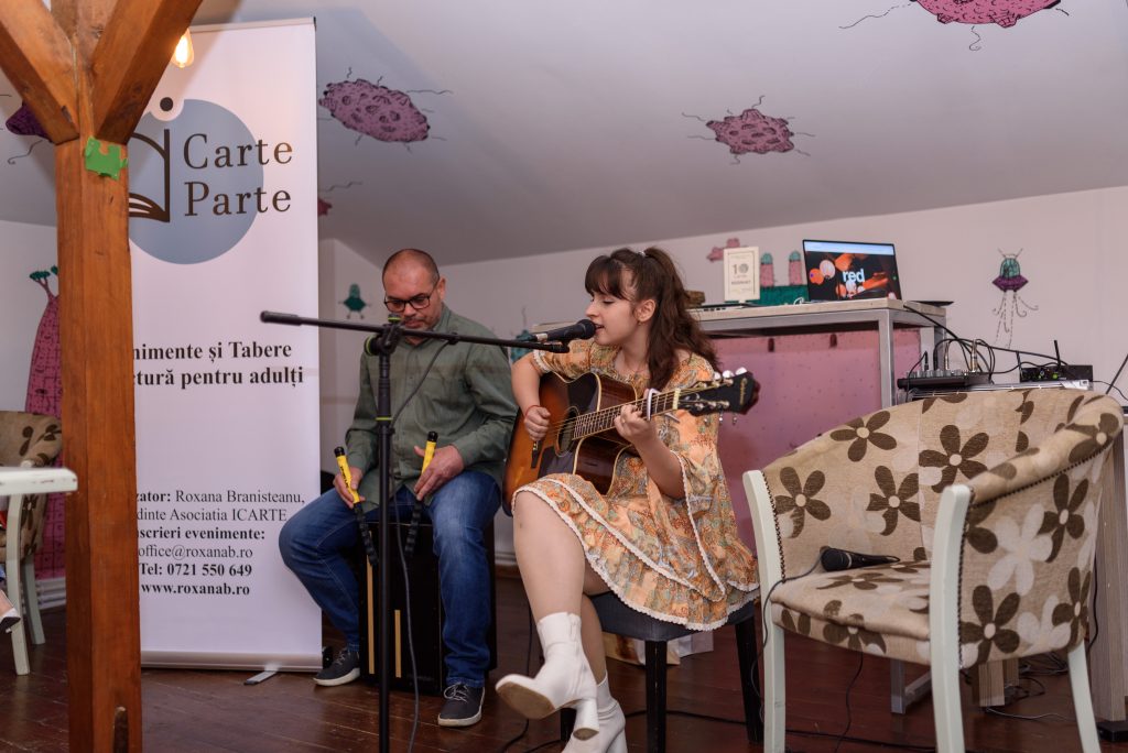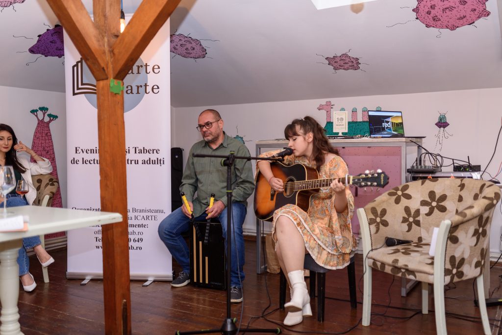 Pe lângă prezentările fascinante, muzica live a adus o notă de bucurie și entuziasm în cadrul Books and Wine. A fost pentru prima dată când am avut la eveniment cel mai tânăr membru al comunității iCarte, iParte – Alma Lorena, în vârstă de 13 ani. Aceasta a cântat la voce și chitară, fiind acompaniată de Vlad Ifrim la cahon, component al trupei Cafea Amară.