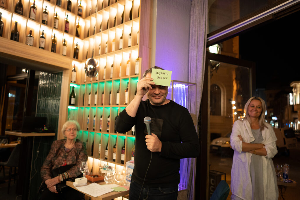 Jocul „Ghicește personajul!” devine tot mai interesant, de la ediție la ediție. Deși el este fost cunoscut din filmul „Ticăloși fără glorie”, nu l-am regăsit jucându-se în nicio activitate literară dintre cele la care am luat parte. L-am jucat într-una dintre taberele de lectură pentru adulți (la Ferma Cobor, în februarie 2023), dar cum acolo sunt multe alte activități și ateliere, nu a mai fost loc să-l introduc și pe acesta. Nu am dorit să se piardă, motiv pentru care îl jucăm în cadrul evenimentelor Books and Wine. Și tare mult ne mai distrăm:).