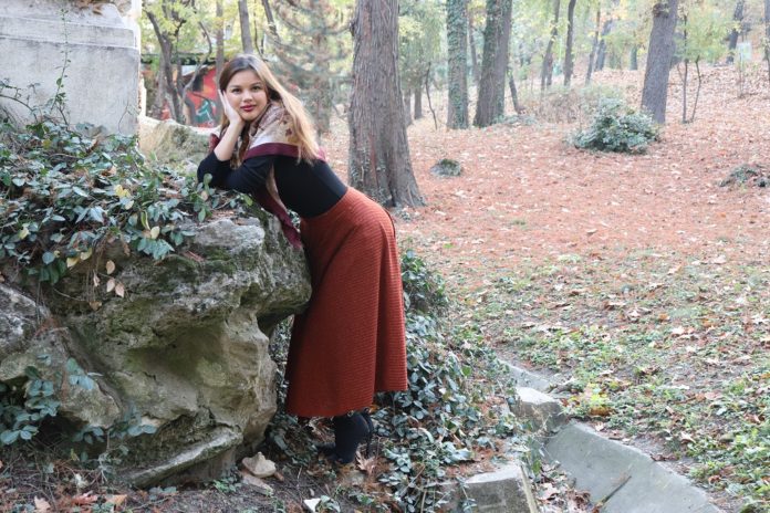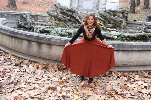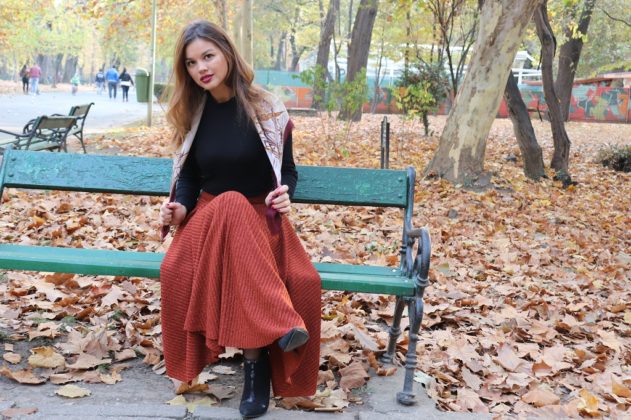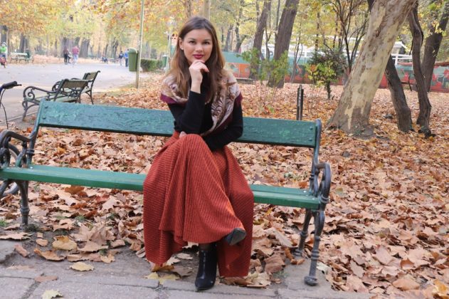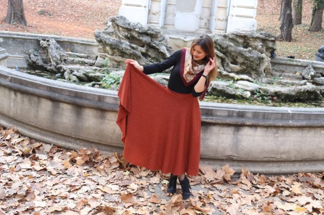 Ce să vă mai spun? Că m-am urcat în mașină cu Ștefania și Alexandra (le mulțumesc că m-au suportat; oricum, s-au dat după mine cu pozatul, așa că veți vedea câteva poze și cu ele 😁) și mi-am pus haine pe umeraș, ghete, stiletto, balerini etc, cum fac modelele când urmează să facă un shooting 😅. Mda, asta am făcut, numai că n-am avut noroc. Greu am găsit un loc de parcare în apropierea Parcului Carol, așa că nu m-am putut schimba în mașină cum mi-am imaginat când am plecat de acasă. Am luat doar fusta cărămizie de mai jos, am pus-o în geantă împreună cu ghetuțele și m-am schimbat direct în parc. Adică nu, nu m-am dezbrăcat. Ăsta-i avantajul unei fuste lungi: o tragi repede pe tine 😁. Na, tot erau curioși care se opreau. Când cineva străin mă privește, parcă-mi pierd din naturalețe. Așa că a durat ceva mai mult până am făcut câteva fotografii (le pun mai jos în galeria foto)