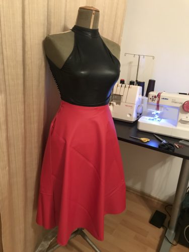 Indicat este să am material cel puțin de două ori cât este lungimea fustei. De data asta, m-am “calicit” un pic și am luat doar 1,50 metri. Asta a însemnat că a trebuit să fac fusta din două bucăți, cusute pe lateral, iar fermoarul a venit pe-o parte. De aceea, am ales să o fac în două unghiuri de 90 de grade. Bine, și pentru că, dacă aș fi ales trei sau patru unghiuri, ar fi însemnat și mai mult volum, iar o fustă de genul chiar nu mi s-ar potrivi. Pe mine mă avantajează fustele scurte sau puțin peste genunchi, cum spuneam și la începutul articolului. Am zis ca anul ăsta să schimb puțin și să port și ceva mai lung de atât.