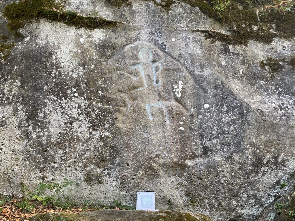 Silueta Cavalerului trac a fost cioplită în stâncă, așa cum se observă și în imagini. Simbolul acestuia este foarte cunoscut până la Marea Mediterană, un simbol al Zeului Gebeleizis, acesta semnificând nemurire, iae calul însemnând puritate. Culoarea albastră este făcută de oameni, pentru a se vedea mai clar, însă sculptatea Cavalerului trac în stâncă ar fi avut loc acum 3500 de ani.
