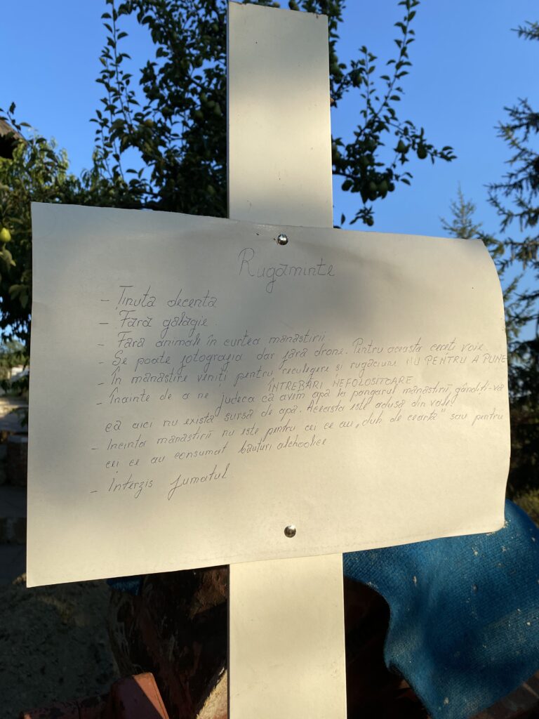 Din șosea până sus, în vârful muntelui, nu faci mai mult de o jumătate de oră. Ar fi totuși ideal să fii cât de cât echipat de drumeție, pentru că potecile sunt înguste și ai de urcate printre stânci, pe alocuri. Vei observa pe traseu – pe lângă minunatul sunet al râului Dâmbovița ce se aude curgând – troițe, cruci, icoane, cățeluși blânzi, păsărele, fluturi, albine, rădăcini de copaci bătrâni, pietre, băncuțe. Și multă verdeață, dacă alegi această perioadă a anului. Se spune că drumul ar fi o reproducere a pașilor și opririlor lui Iisus pe dealul Golgotei. Niciodată, pe niciun traseu pe care l-am făcut, pe niciun munte, nu au curs apele de pe mine ca acum. Eu nu transpir atât de puternic nici la catchball sau la sală, dar nici când am urcat la peste 2000 de metri. Pe acest drum, până când am ajuns la mănăstire, aproape aș fi stors maieul de pe mine. Era ora 19.00, deci nu chiar o căldură insuportabilă. Iar când ajungi, după ce urci treptele… ai să vezi :). Sunt două biserici: cea veche, aflată în peșteră, și cea nouă, din lemn, construită în frumosul stil maramureșean.